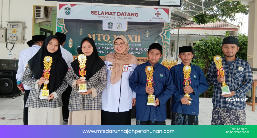 Prestasi membanggakan kembali ditorehkan oleh siswa MTs Darun Najah dalam ajang Musabaqah Tilawatil Qur’an (MTQ) Tingkat Kecamatan Sumbersuko yang diselenggarakan pada Rabu, 14 Januari 2026. Empat siswa berhasil meraih juara pada cabang Kaligrafi Kontemporer, menunjukkan kemampuan terbaik dalam seni tulis Al-Qur’an.